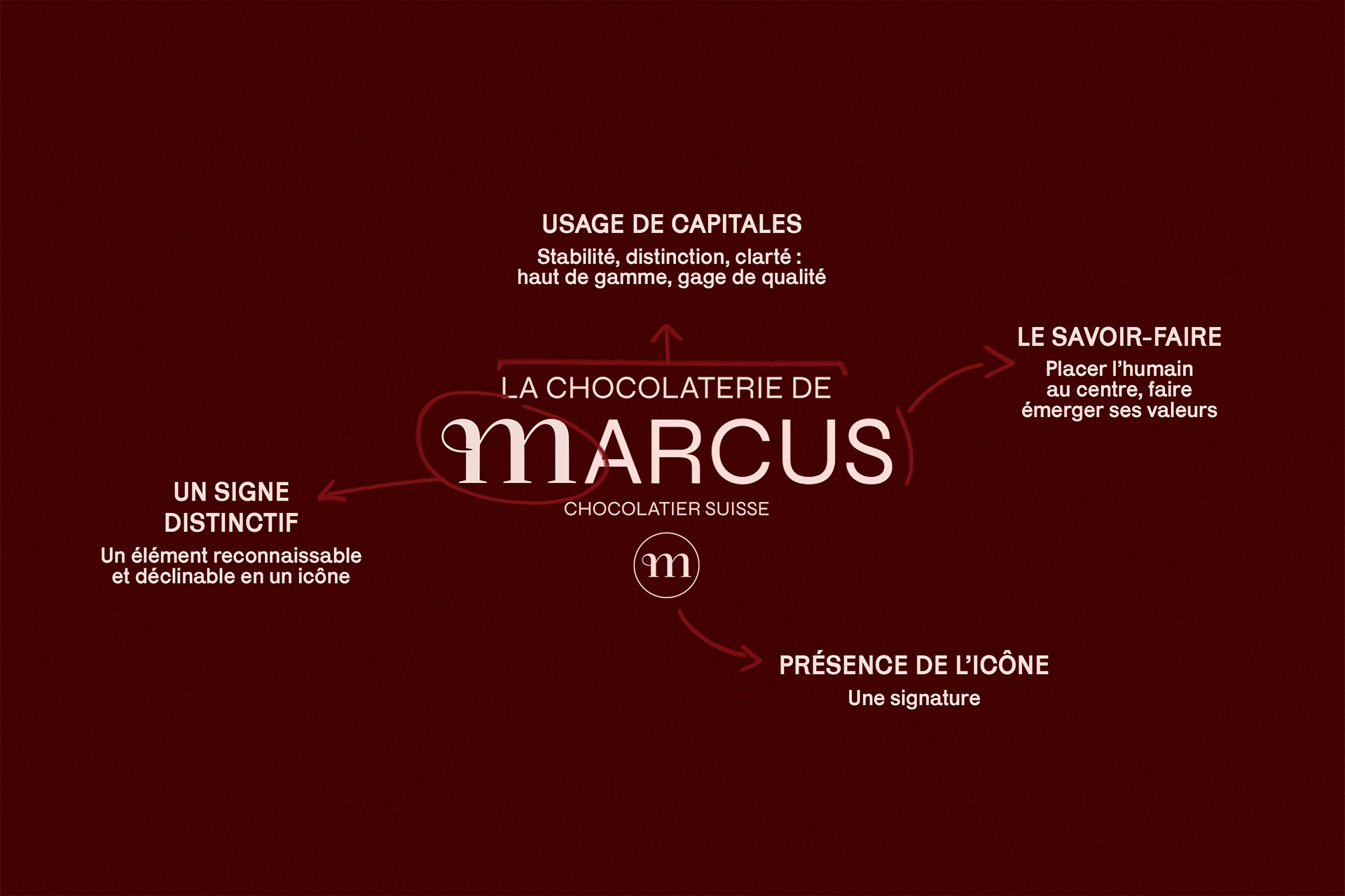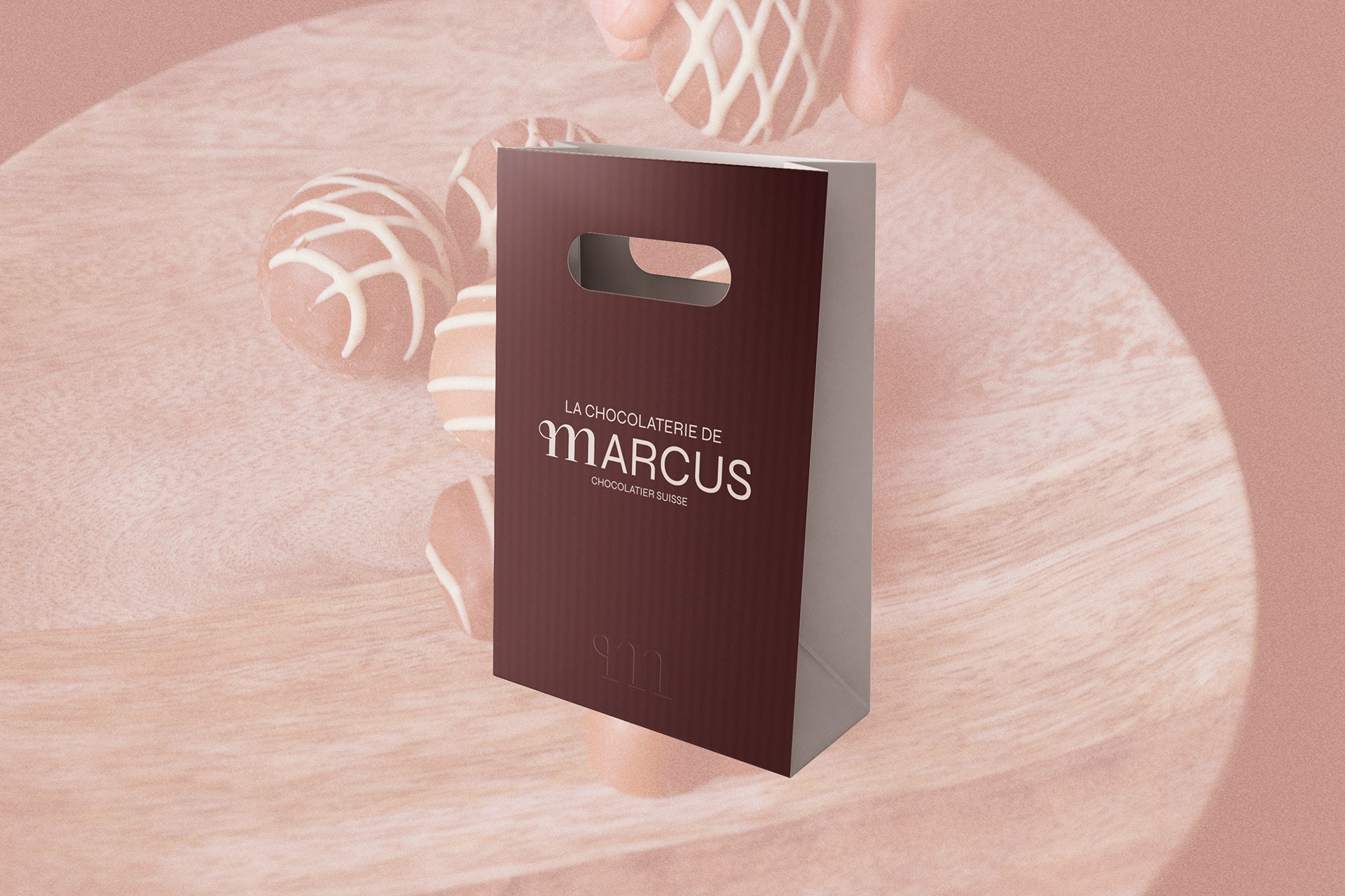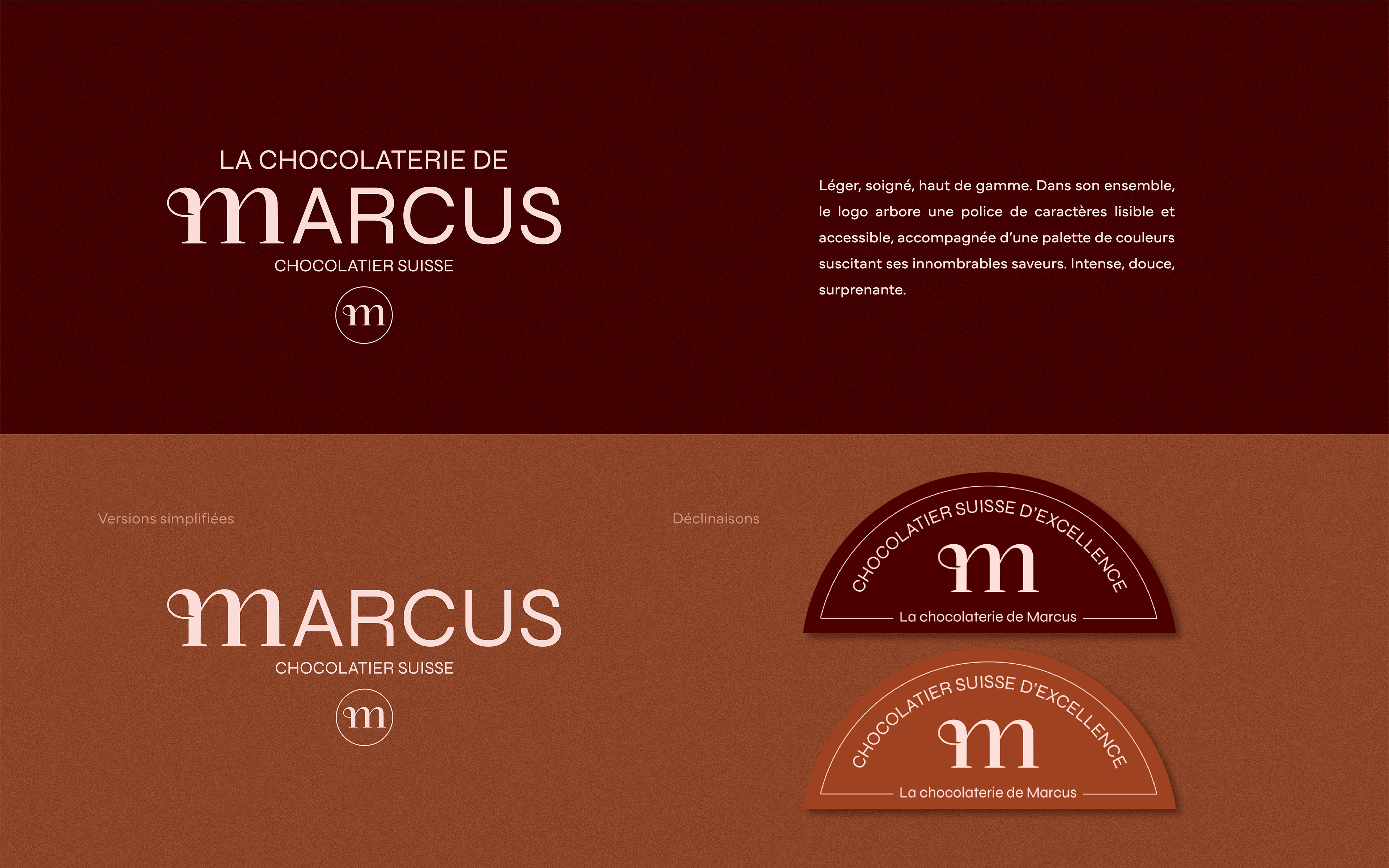 L'identité visuelle que j'ai créée s'articule autour de trois grandes valeurs : - le savoir-faire - l'artisanat - la précision Elles donnent à cette identité un sens, une direction, une authenticité. Ici, l'expertise et L'humain sont chers à Marcus. Le savoir-faire est un aspect essentiel qui trouve toute sa place. Léger, soigné, haut de gamme. Le logo arbore une police de caractères lisible et accessible, accompagnée d'une palette de couleurs suscitant ses innombrables saveurs. Intense, douce, surprenante. Et parce que son logo doit pouvoir s'intégrer efficacement quel que soit son support, il a été pensé comme une signature, faisant émerger la première lettre de son prénom. Une signature gage de qualité et d'authenticité. Facilement déclinable, elle porte l'ADN de la chocolaterie avec ses valeurs.